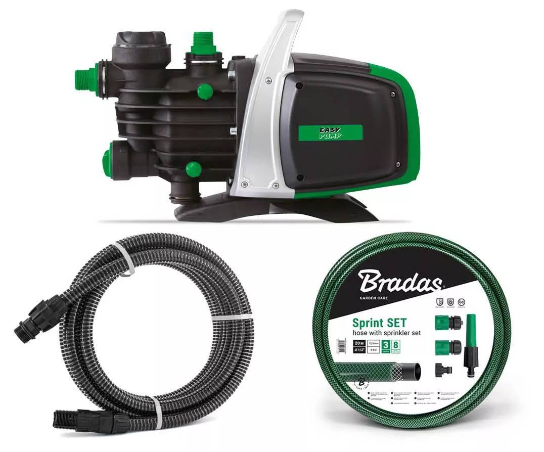 Výhodná sada pro občasné zalévání zahrady z nádrže na dešťovou vodu. Samonasávací zahradní čerpadlo včetně sací soupravy a hadicového setu pro okamžité použití.